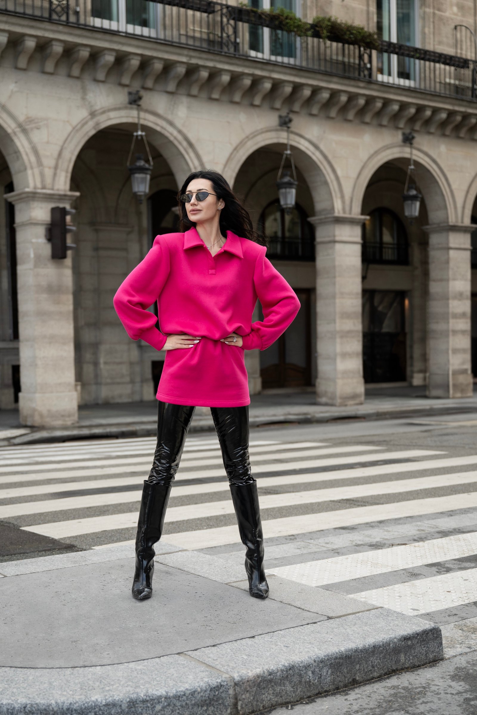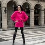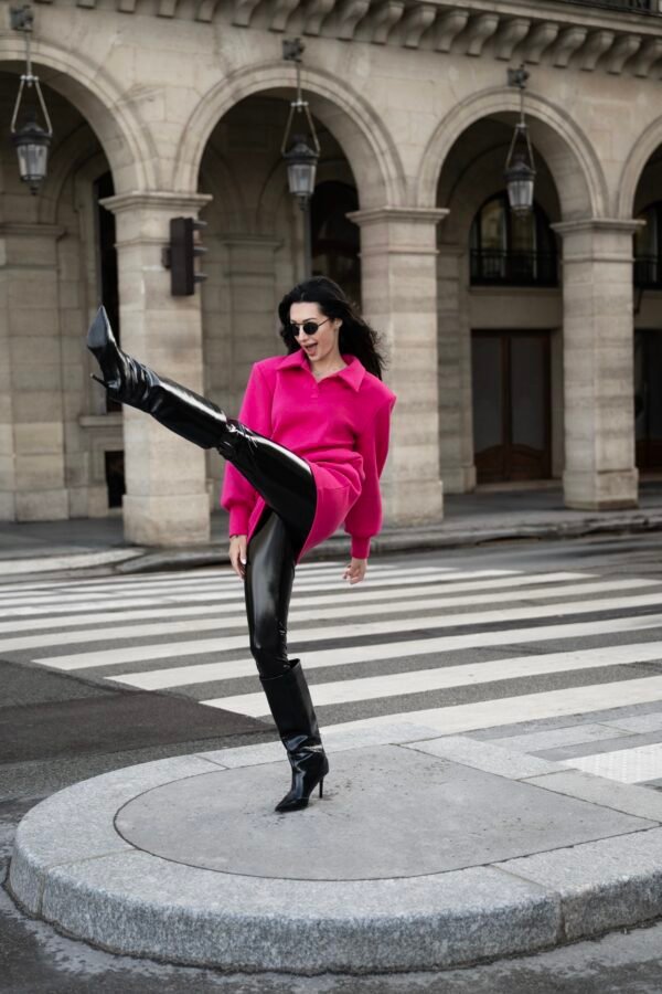 One-Piece Cyclamen dress – struktūruota mini suknelė, įkvėpta stiprių 90-ųjų siluetų. Pabrėžti pečiai ir architektūriška forma kuria modernų, miesto įvaizdį.