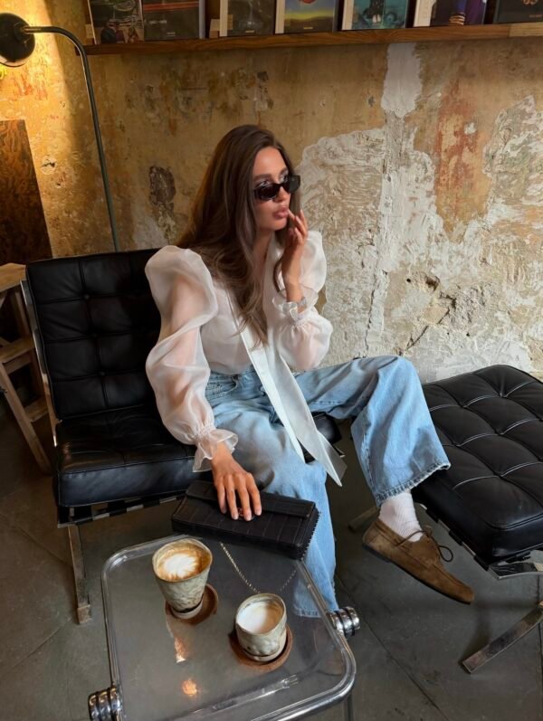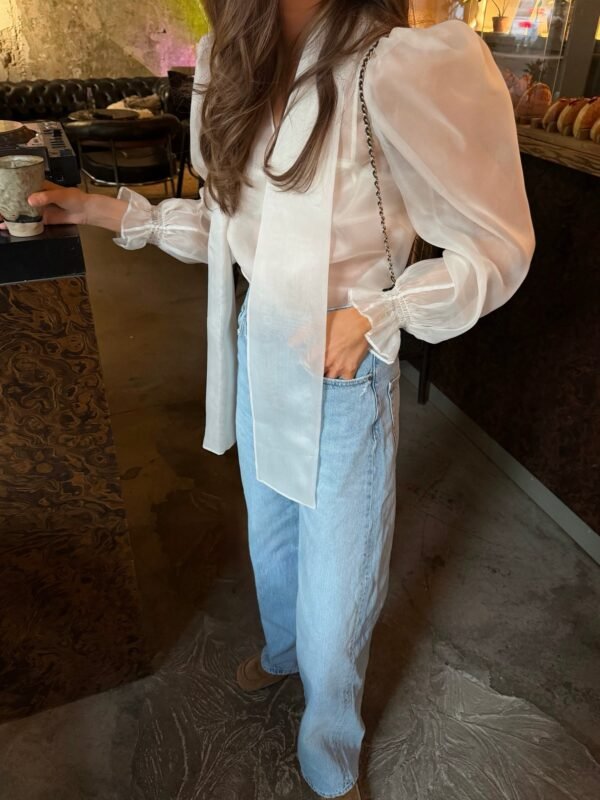 100% šilko organzos marškiniai, kuriuos išskiria lengvumas ir subtili struktūra.