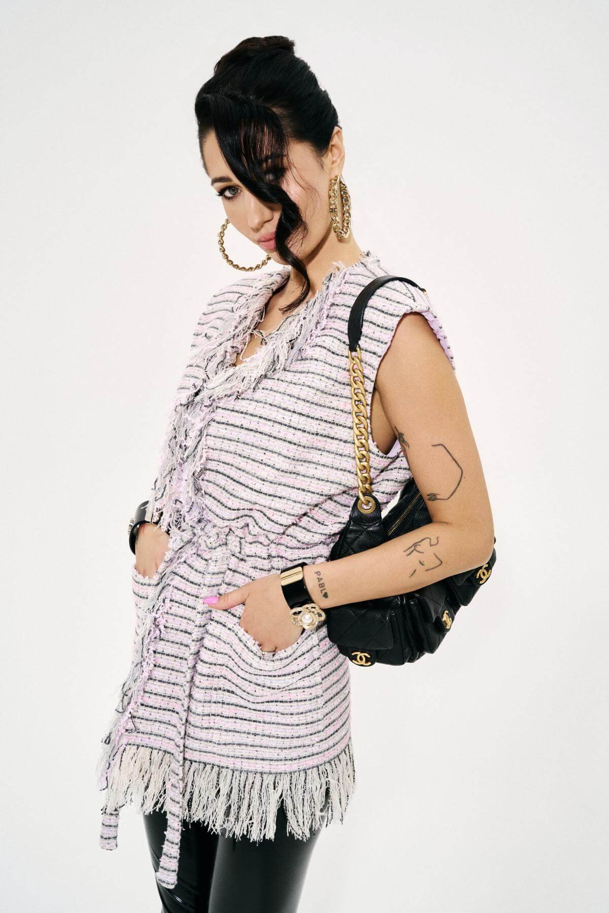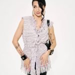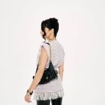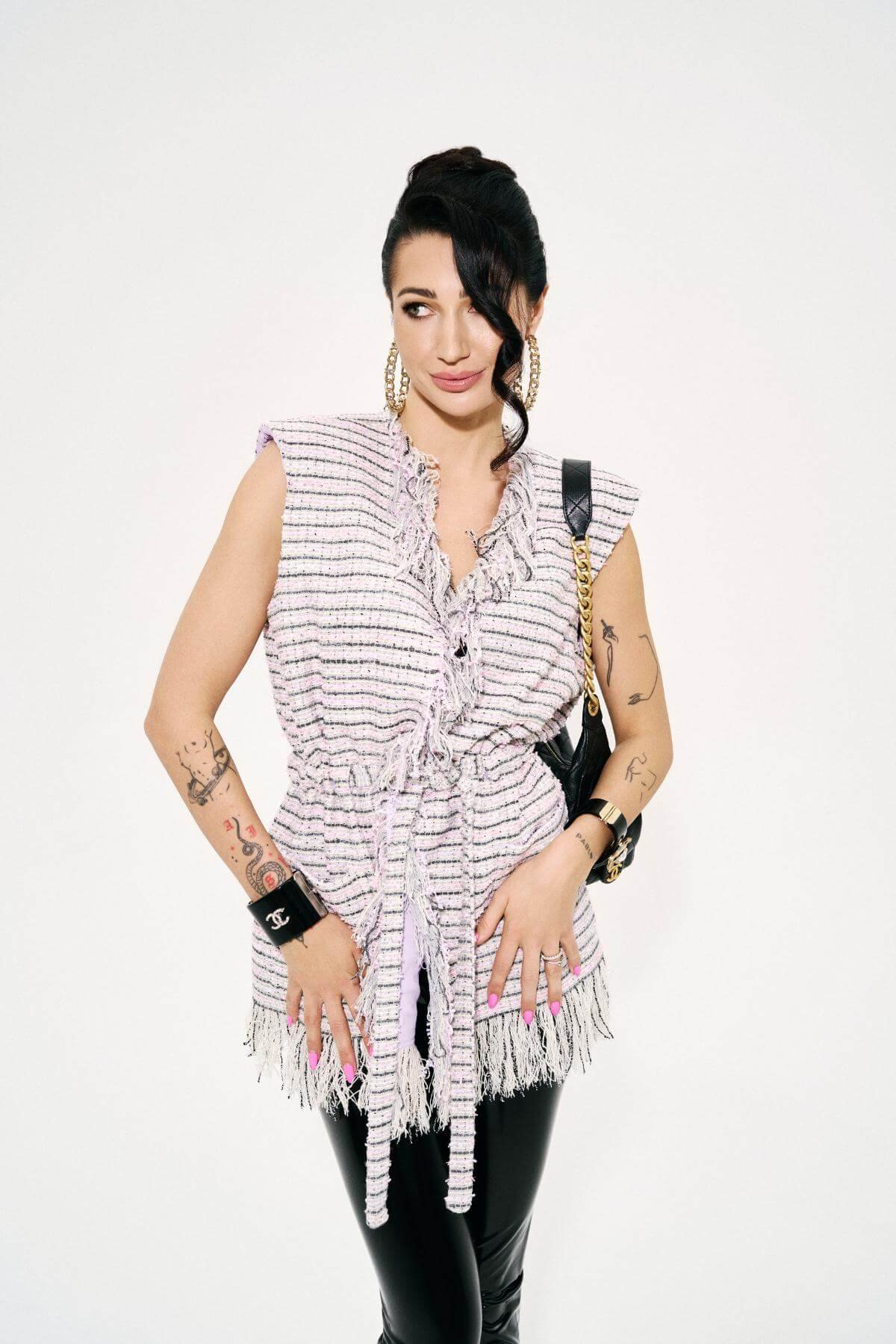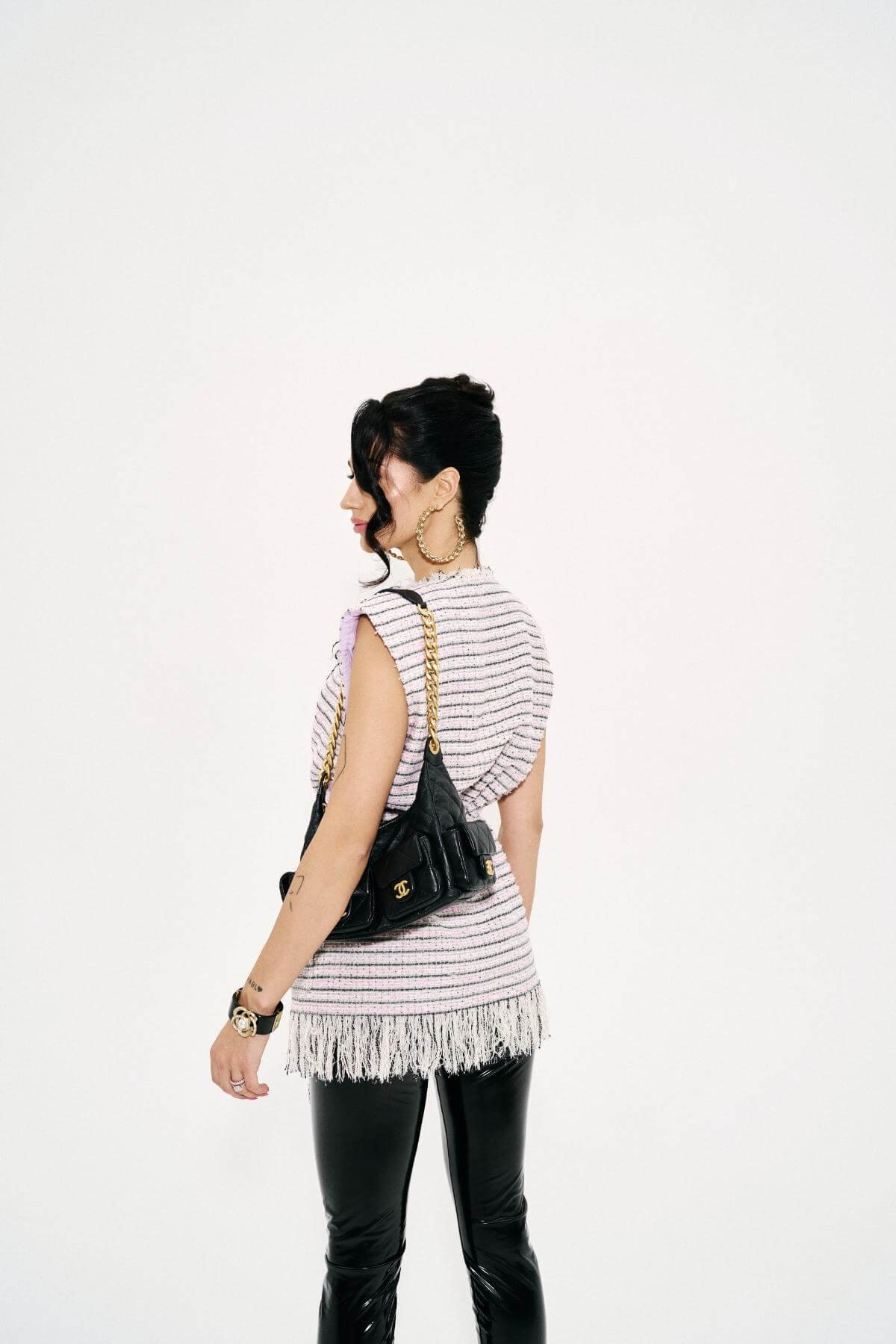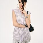 The Outline Vest/Blush Stripe – tai formos tyrinėjimas: aštri ten, kur reikia, ir švelni ten, kur norisi. Stovintys pečiai sukuria užtikrintą rėmą, o per liemenį suveržiamas dirželis išgrynina liniją – aiškią, tikslią, moterišką.