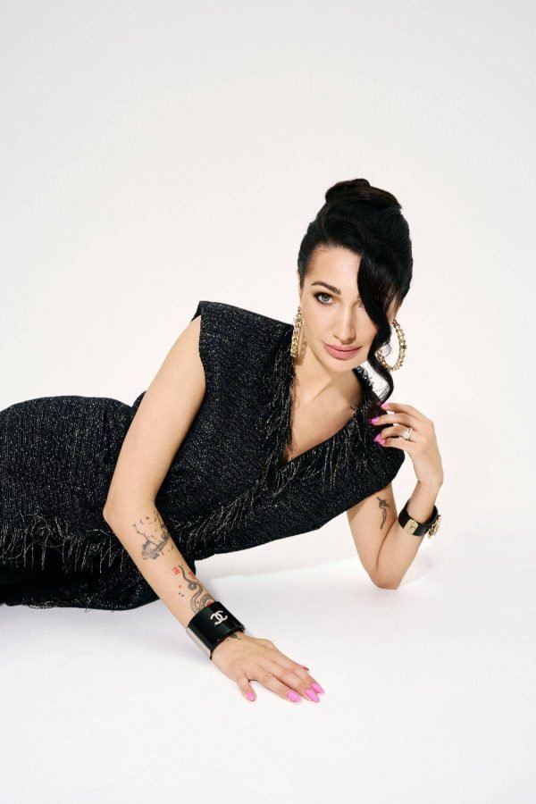 Stovintys pečiai sukuria užtikrintą rėmą, o per liemenį suveržiamas dirželis išgrynina liniją — aiškią, tikslią, moterišką.