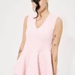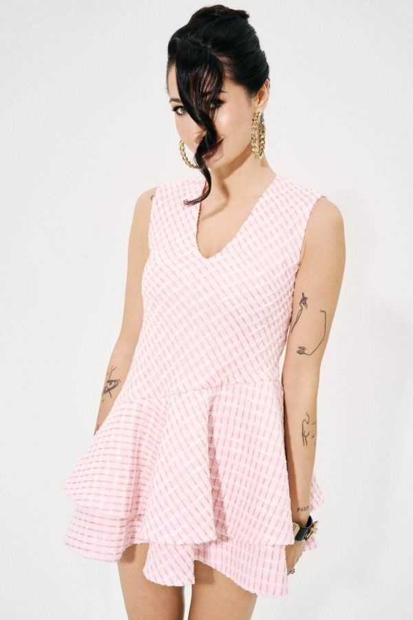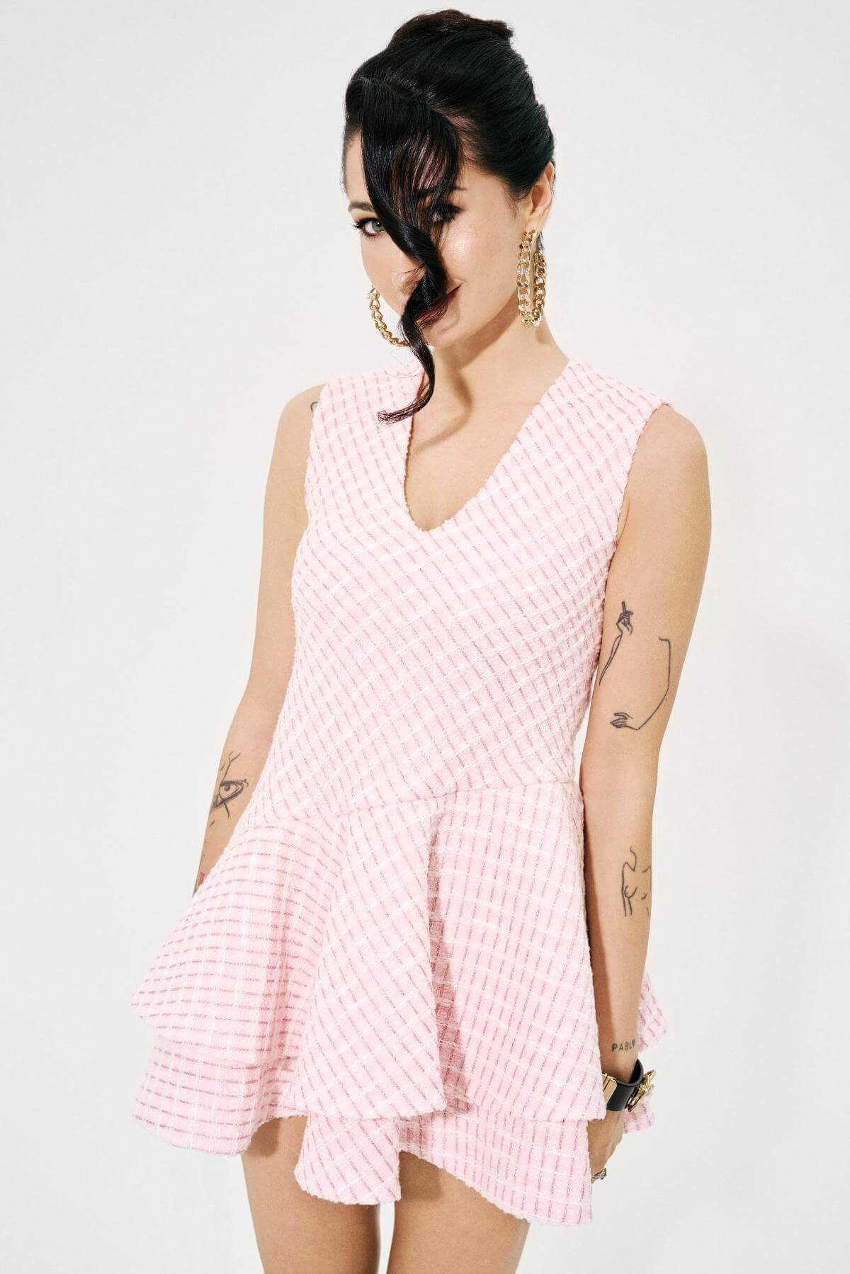 The Tweed Sculpture Dress/ Blush Weave – struktūrinė tvido suknelė, išsiskirianti savo architektūriniu peplum siluetu.