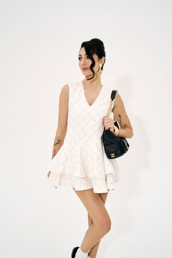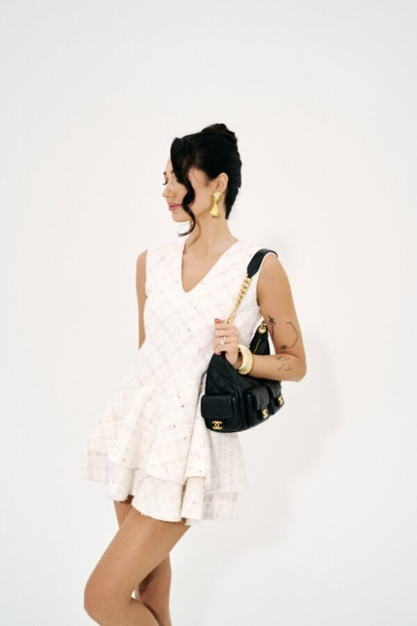 The Tweed Sculpture Mini Dress/Pastel Mosaic – struktūrinė tvido suknelė, išsiskirianti savo architektūriniu peplum siluetu.